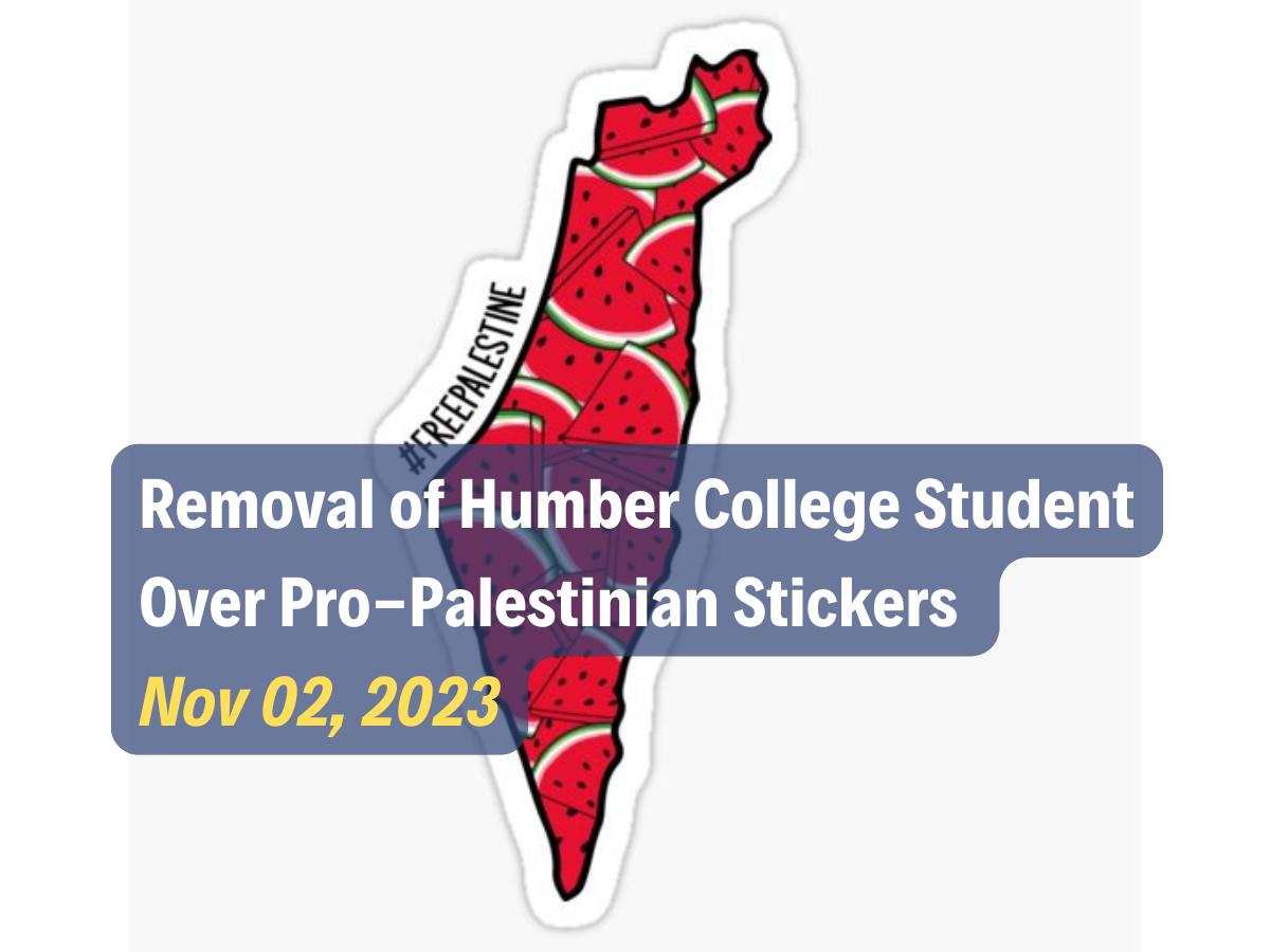 [4] [4] Jabakhanji, Sara, “Humber College voices 'regret' after student removed from campus for posting Palestinian flag stickers,” Nov. 07, 2023, CBC, accessed Oct. 22, 2024 https://www.cbc.ca/news/canada/toronto/humber-student-boycott-israeli-apartheid-1.7020897