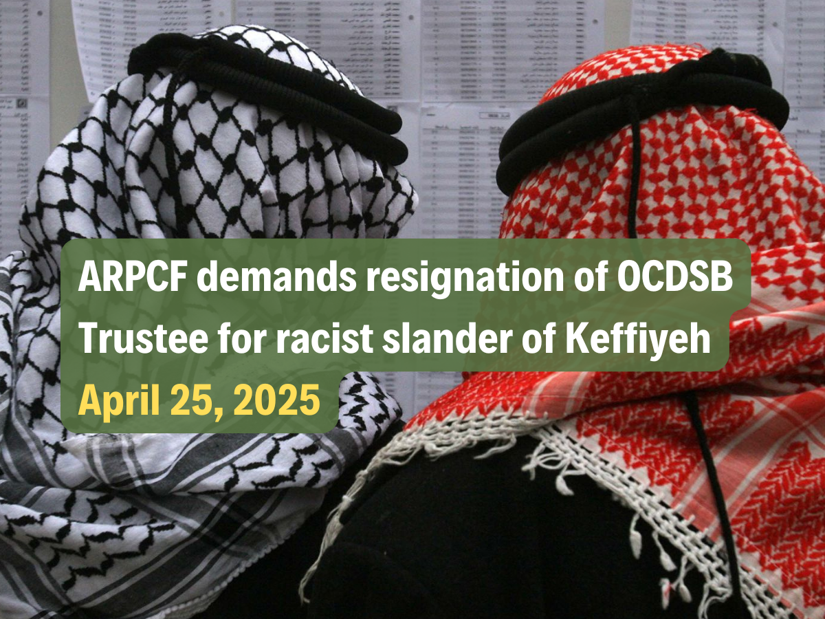The ARPCF stands with parents, students, and community members who are calling for immediate action. We demand that the OCDSB discipline Trustee Nili Kaplan-Myrth for her racist statement, issue a public apology to affected students and families, and affirm its commitment to combating all forms of racism, including anti-Palestinian racism. We urge community members to write to the board, speak at upcoming meetings, and insist that human rights policies be upheld without bias. Palestinian identity is not aggression—it is culture, history, and belonging. The OCDSB must do better in upholding its responsibility to foster a safe, respectful, and truly inclusive learning environment for all..